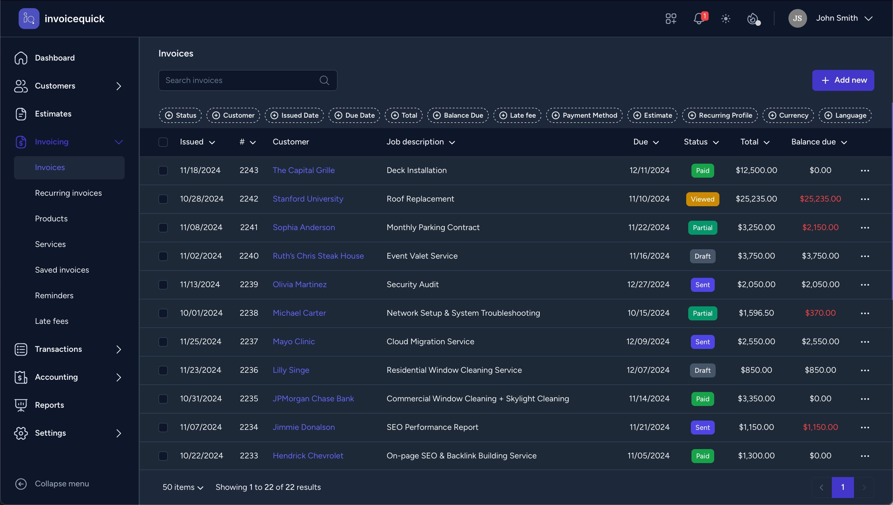 InvoiceQuick gives you everything you need to stay on top of your business. Clean, intuitive, and powerful enough to help you fully in control.